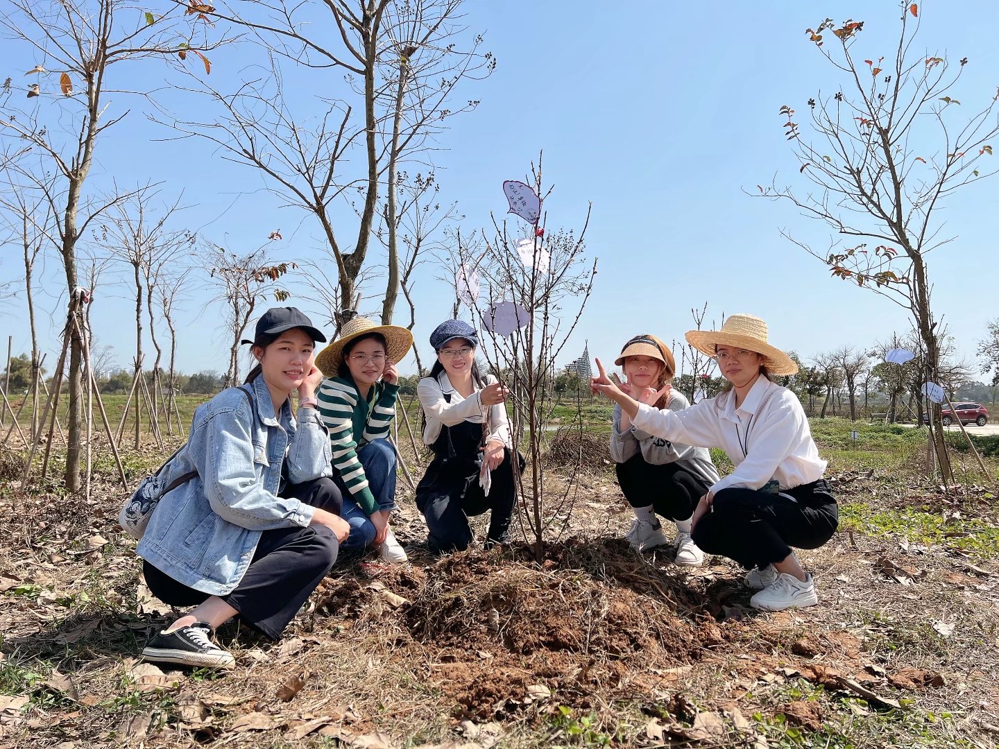 大家一改往日柔美文靜的形象,擼起袖子、熱情高漲、干勁十足。揮鍬、鏟土、放苗、培土、澆水,經過各小組齊心協力,很快便形成了一小片桃樹林,一株株桃樹苗向陽而立。