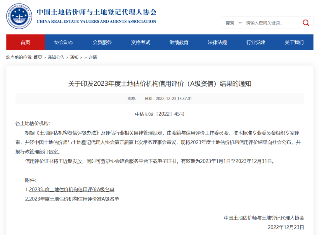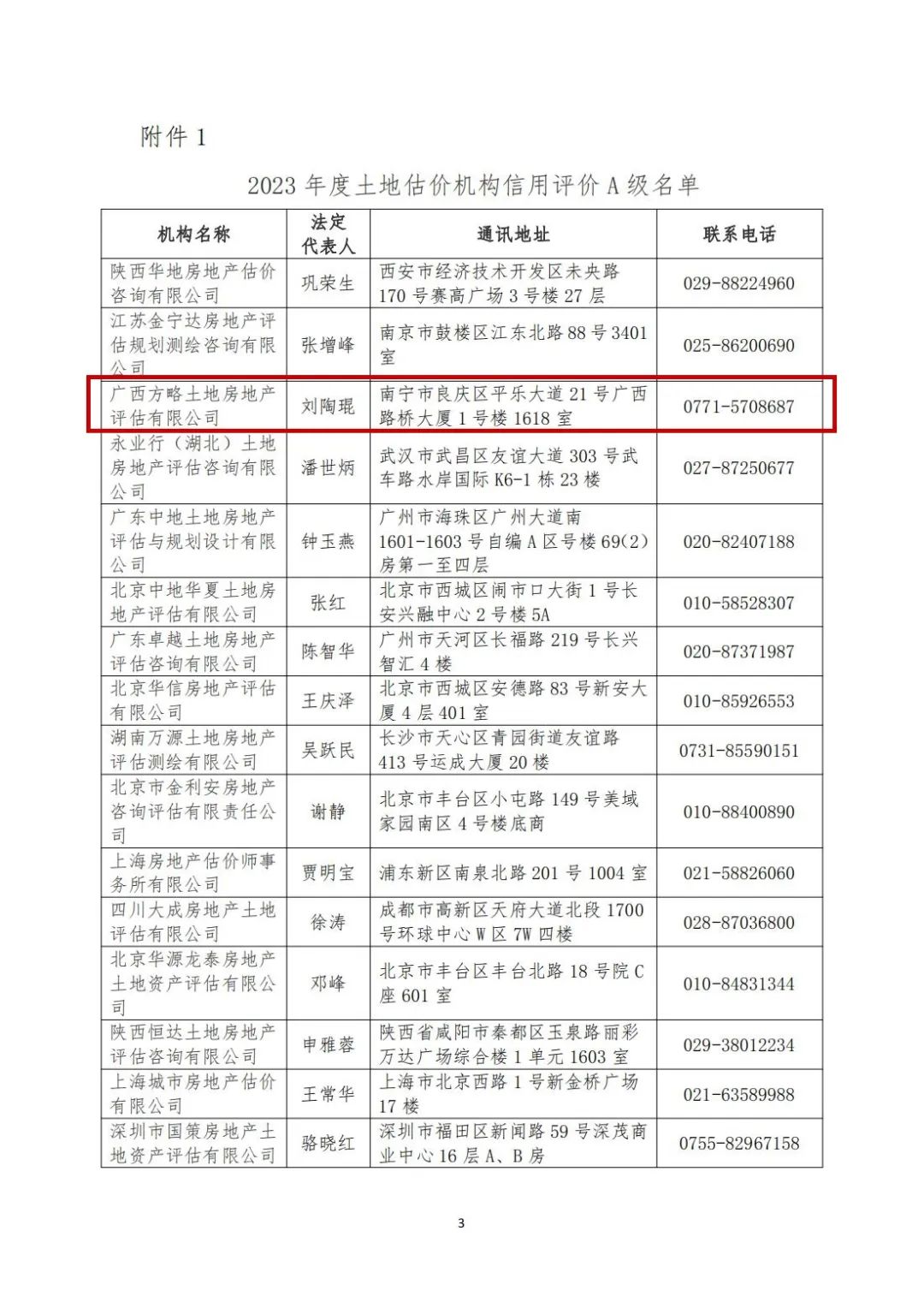 2022年12月23日,中國土地估價師與土地登記代理人協會正式發布了《關于印發2023年度土地估價機構信用評價(A級資信)結果的通知》(中估協發〔2022〕45號),廣西方略土地房地產評估有限公司再次榮獲“A級資信土地估價機構”,取得全國第三的好成績。