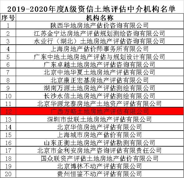 2019年5月31日,中國土地估價師與土地登記代理人協會(以下簡稱中估協)對所選出的2019-2020年度A級資信土地評估中介機構進行公示。在全國入圍的120家機構中,廣西方略土地房地產評估有限公司排名位居全國第12名。