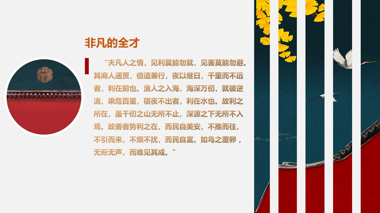 “夫凡人之情,見利莫能勿就,見害莫能勿避。其商人通賈,倍道兼行,夜以繼日,千里而不遠者,利在前也。漁人之入海,海深萬仞,就彼逆流,乘危百里,宿夜不出者,利在水也。故利之所在,雖千仞之山無所不止,深源之下無所不入焉。故善者勢利之在,而民自美安,不推而往,不引而來,不煩不擾,而民自富。如鳥之覆卵 ,無形無聲,而唯見其成。”