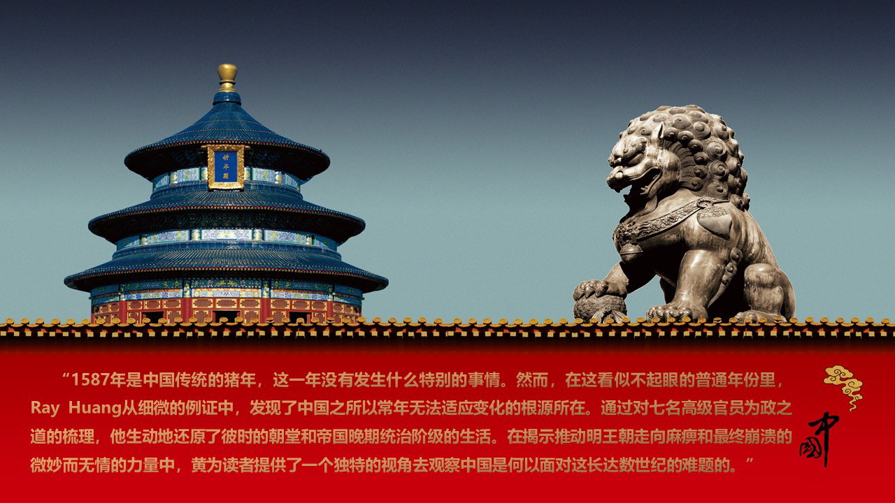在耶魯大學1981年出版的一本書中,有一段記敘,其中文譯文為:“1587年是中國傳統的豬年,這一年沒有發生什么特別的事情。然而,在這看似不起眼的普通年份里,Ray Huang從細微的例證中,發現了中國之所以常年無法適應變化的根源所在。通過對七名高級官員為政之道的梳理(實際為六人),他生動地還原了彼時的朝堂和帝國晚期統治階級的生活。在揭示推動明王朝走向麻痹和最終崩潰的微妙而無情的力量中,黃為讀者提供了一個獨特的視角去觀察中國是何以面對這長達數世紀的難題的。”